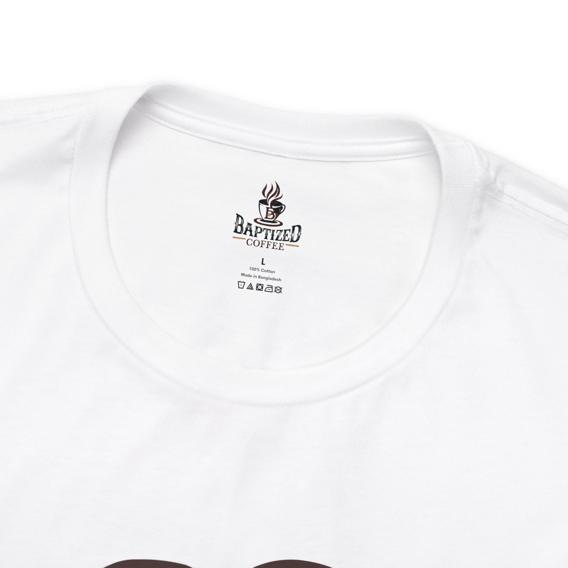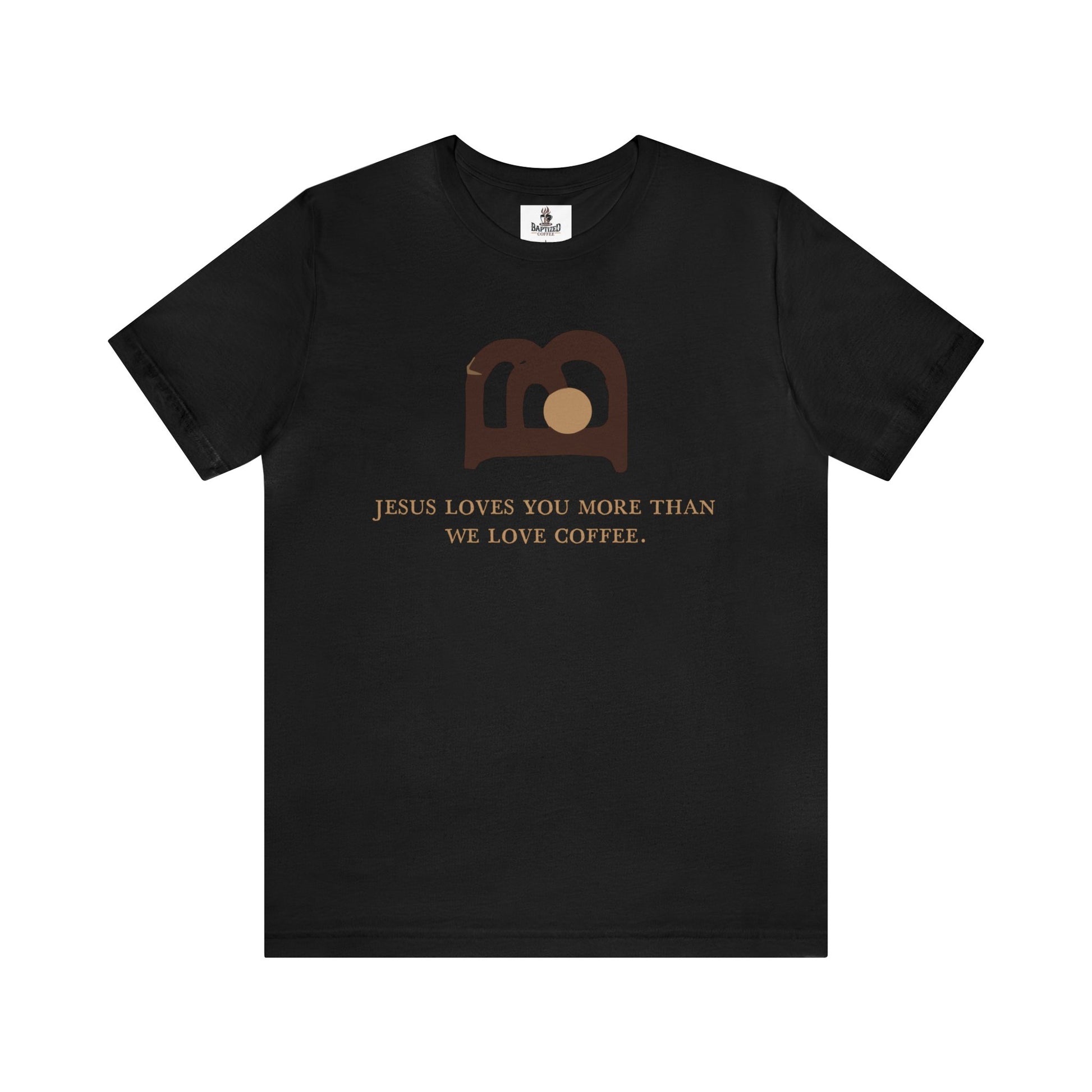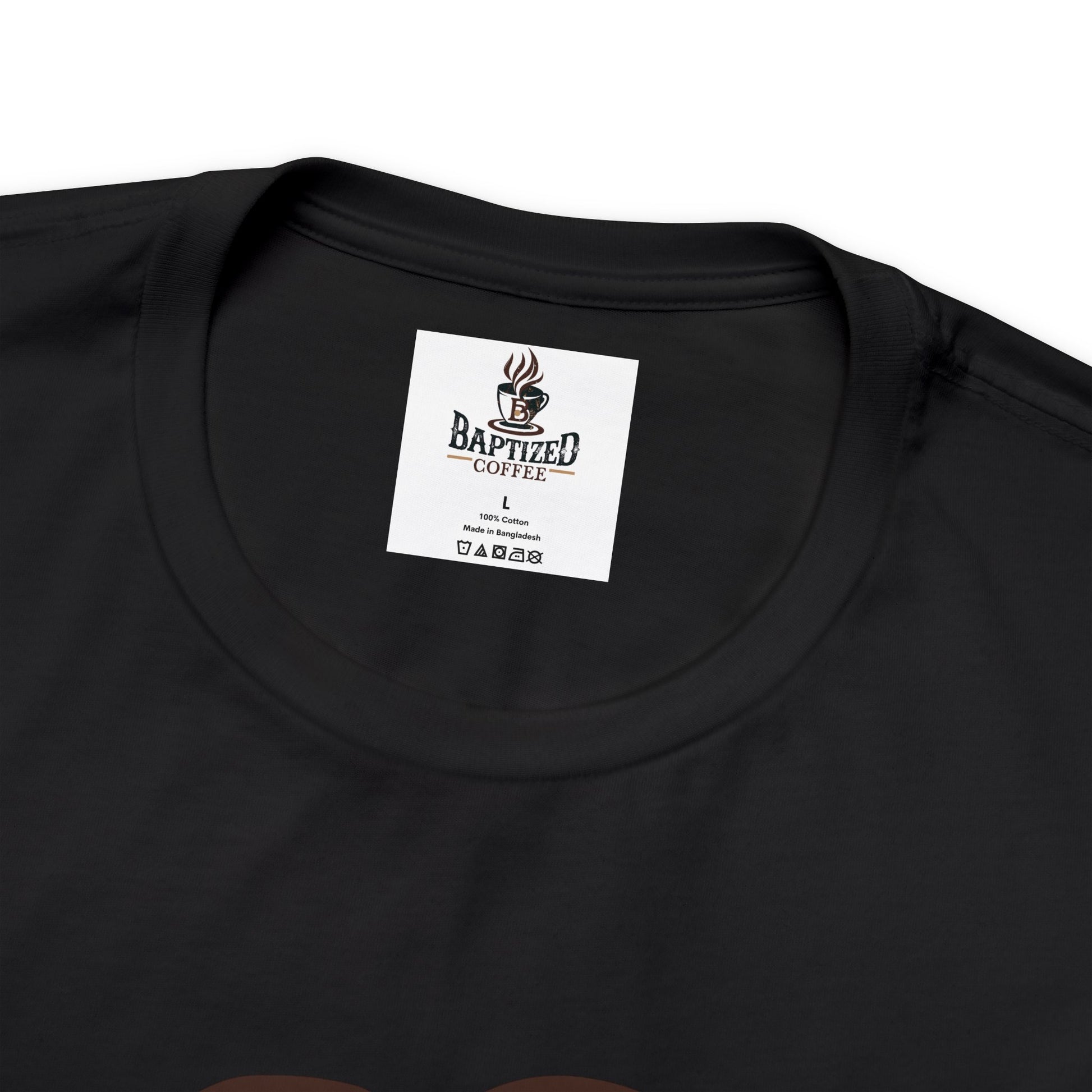 Arise and witness the holy garment of faith, the Baptized T-Shirt! More than mere fabric, this is a sacred vestment that proclaims the greatest love story ever told: "Jesus loves you more than we love coffee", a bold declaration written across your very being.
